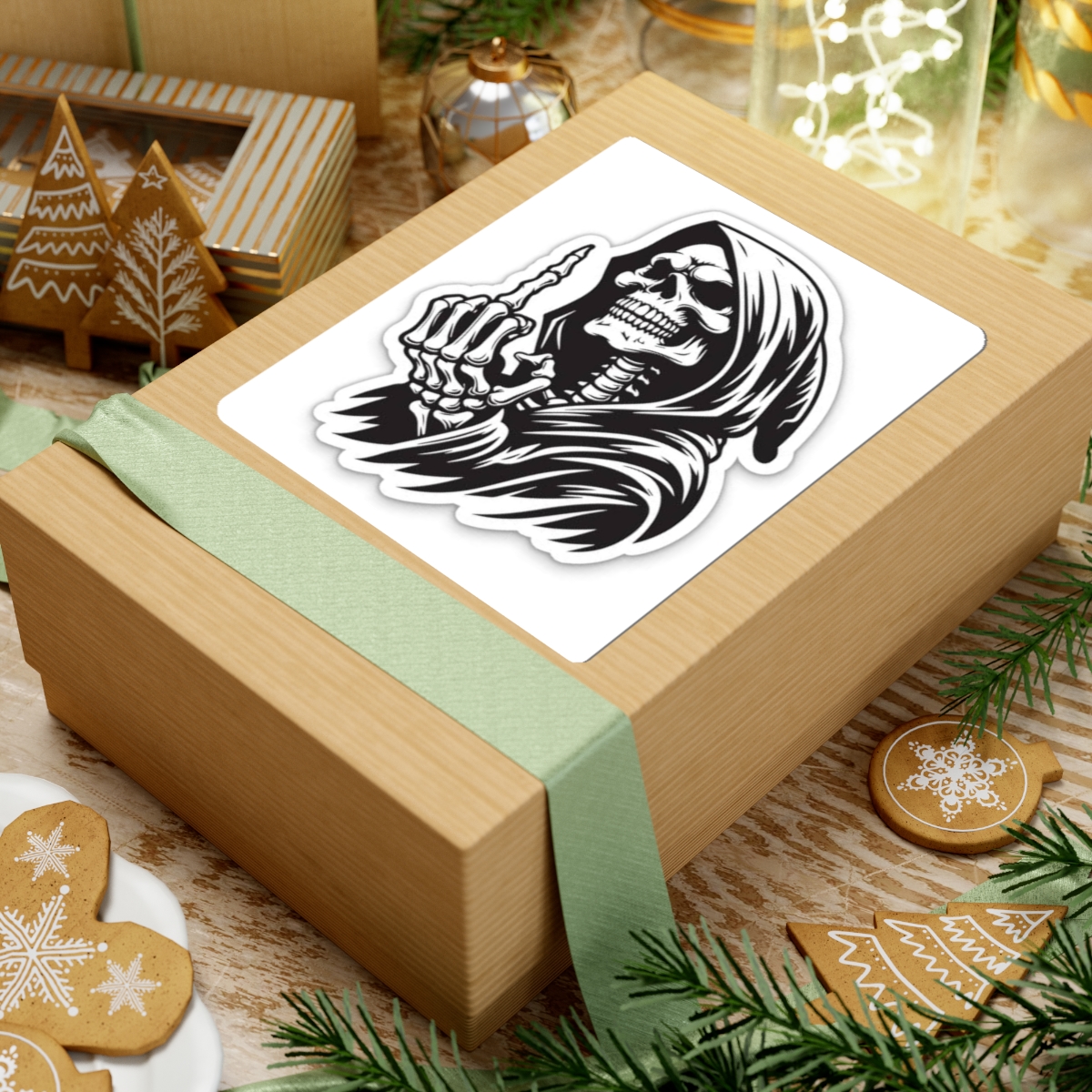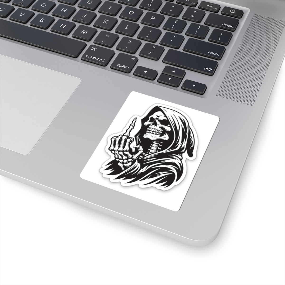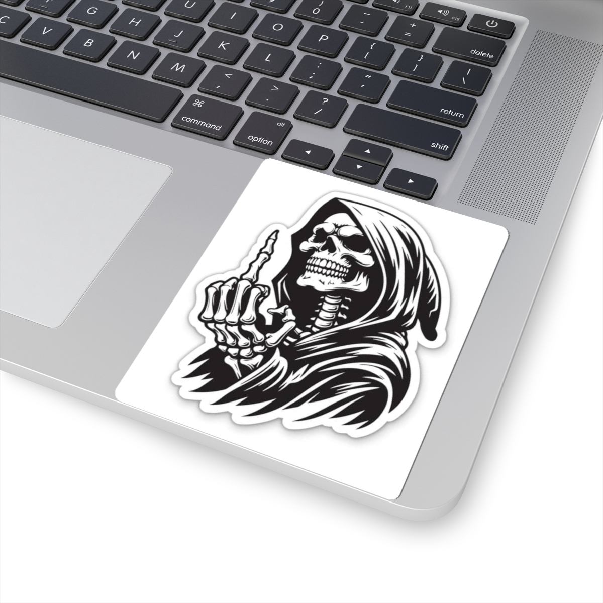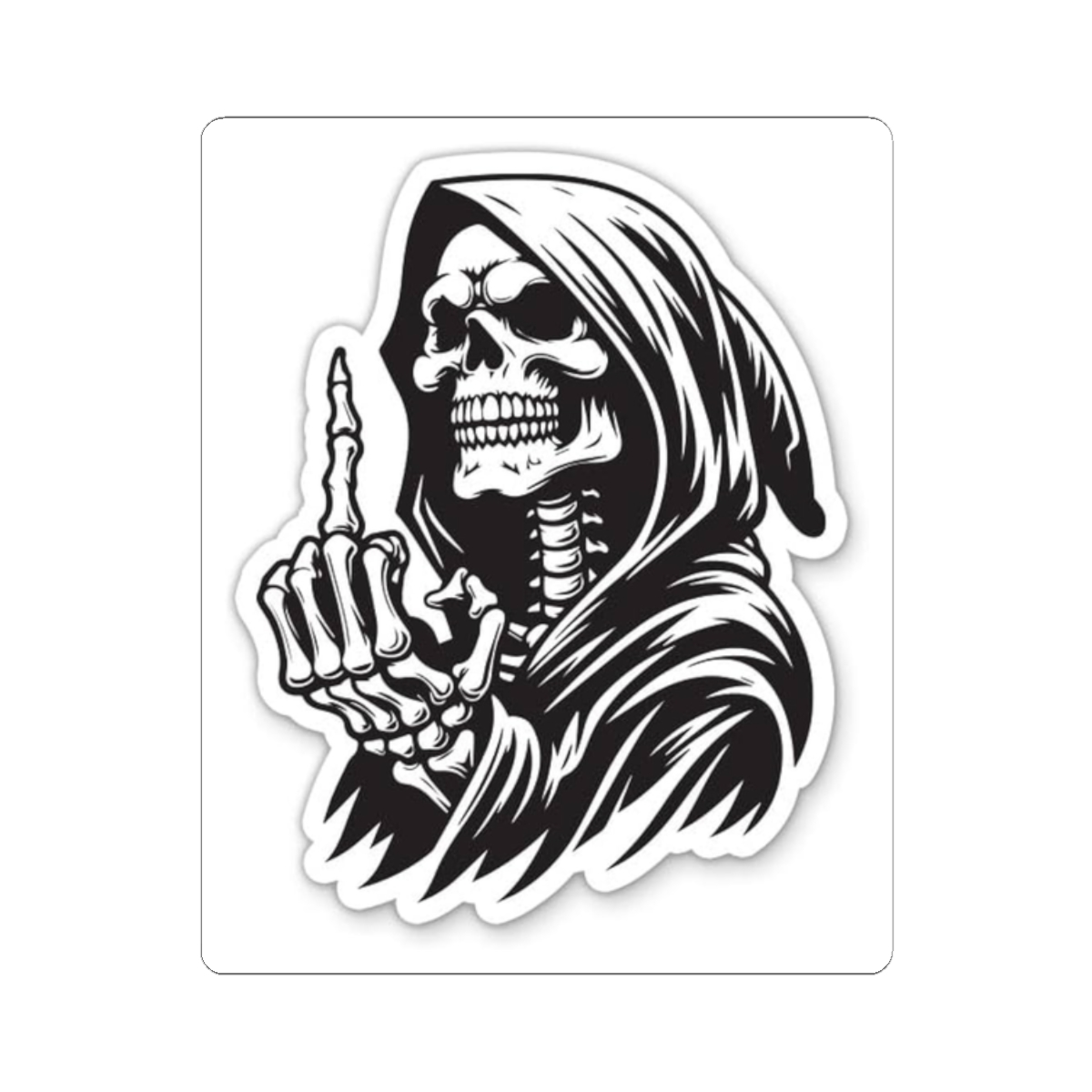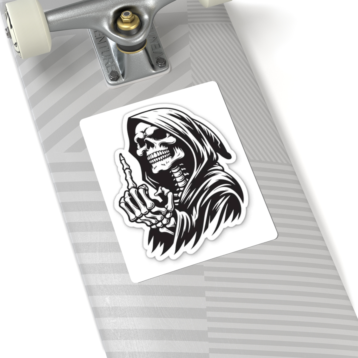 Bring a bold, rebellious edge to your gear with this high-contrast kiss-cut sticker. The stark black-and-white skeleton in a hooded cloak delivers attitude in a compact, glossy package — the kind of decal that makes a statement on a laptop lid, notebook, or guitar case. It reads as both vintage tattoo flash and punk iconography, so it fits naturally into a collection of dark, alternative aesthetics. Apply it smoothly and watch the rich eco-solvent inks pop against the glossy finish. Whether you stick it on road-trip kit, a studio board, or everyday carry, it adds a brash, confident mood that says you don’t follow trends — you set them.