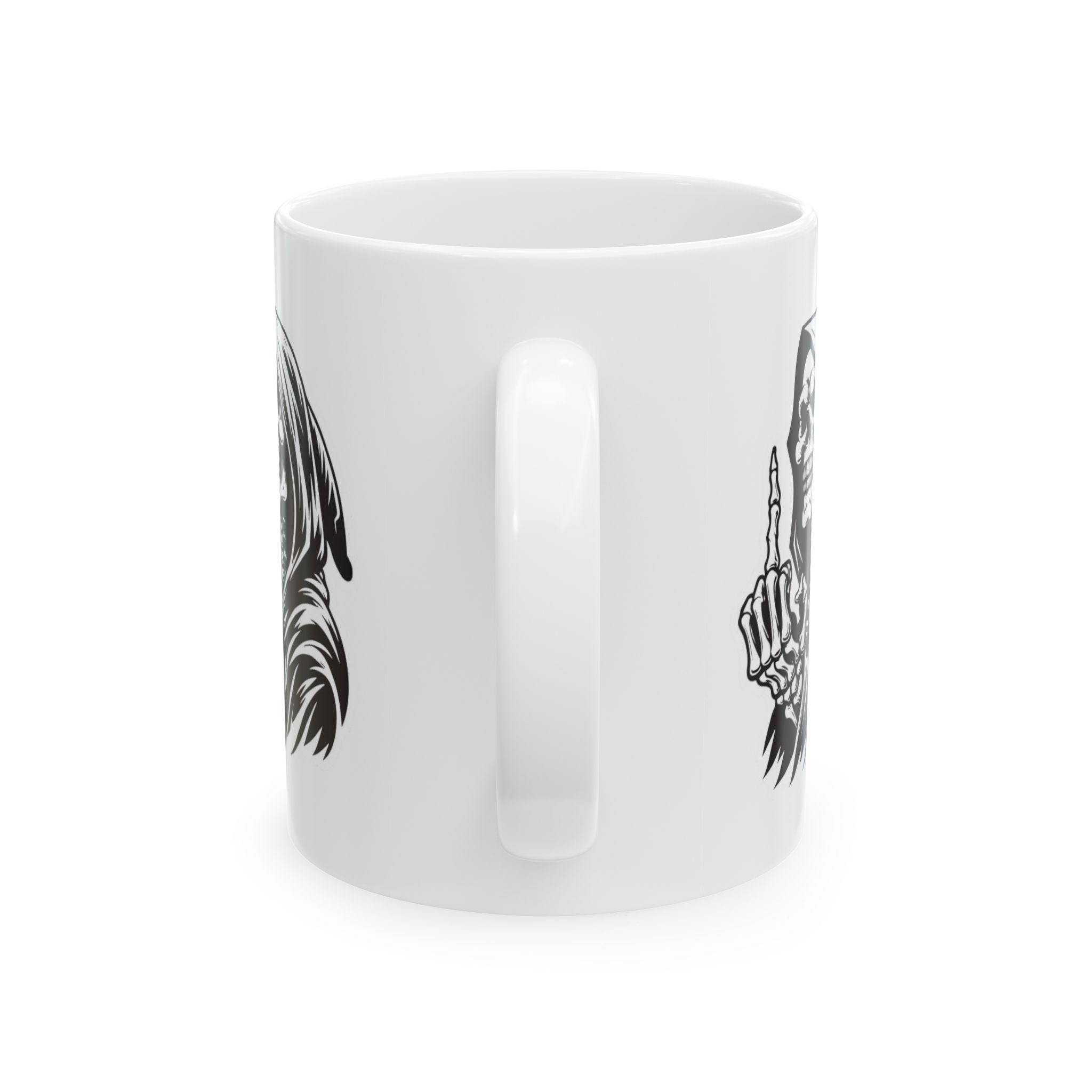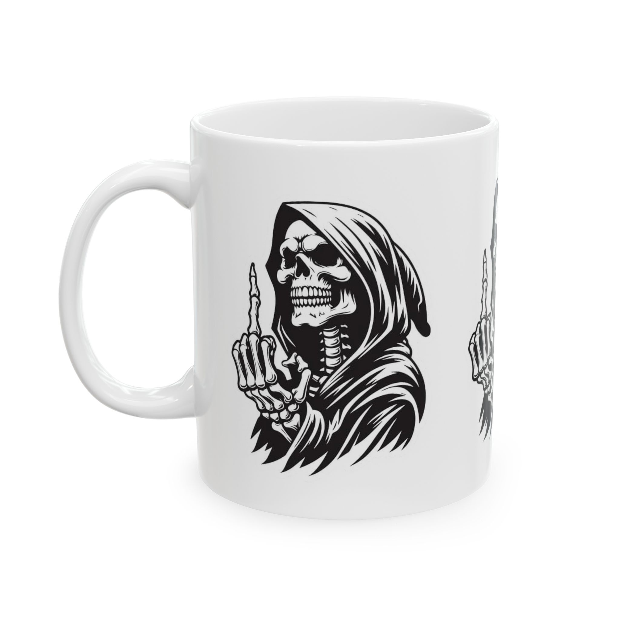 This glossy ceramic mug carries bold, monochrome artwork—a hooded skeleton flipping the bird—wrapped around its surface. It feels like a private laugh shared with kindred spirits: a little rebellious, a little dark, and entirely unapologetic. Hold it when you need a morning jolt and a smile that says you won’t be messed with. The C-handle sits comfortably in your hand while the vibrant print resists fading through daily use. Comes in two sizes so you can choose a compact sip or a long, slow brew for late-night playlists and slow mornings.