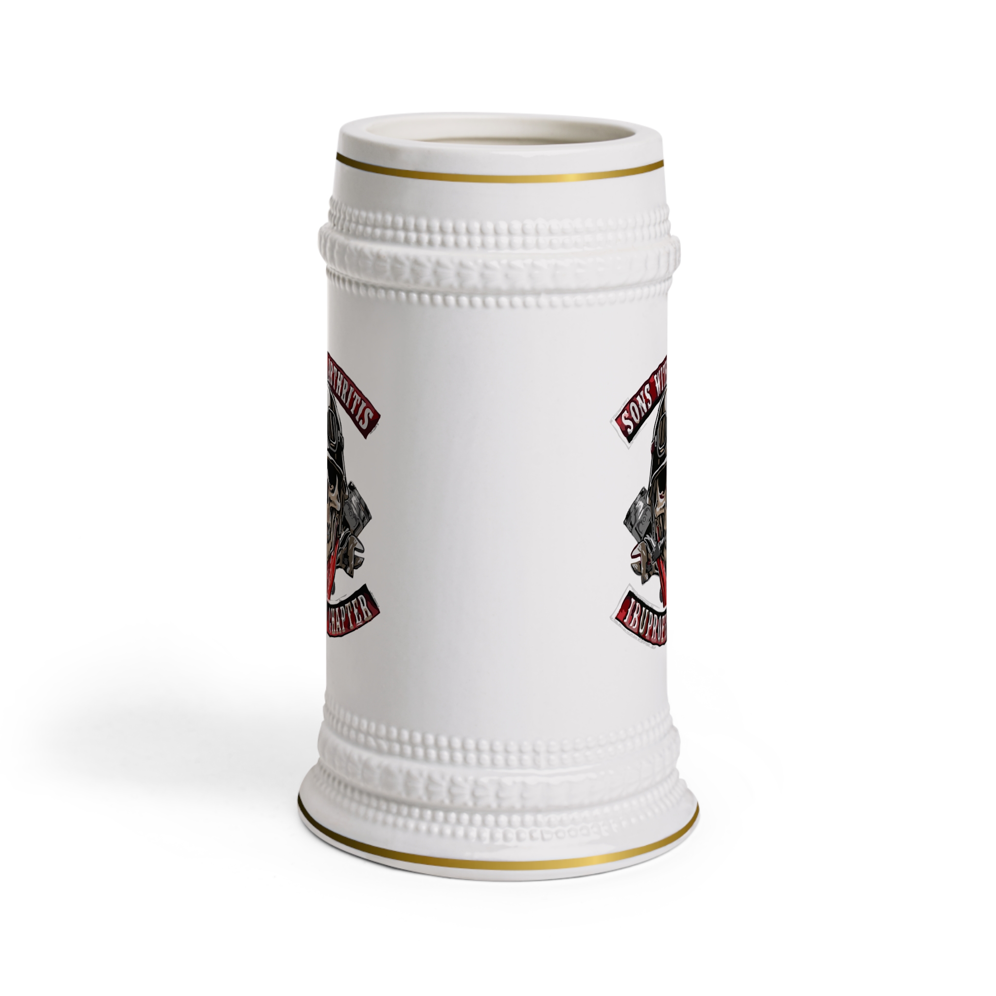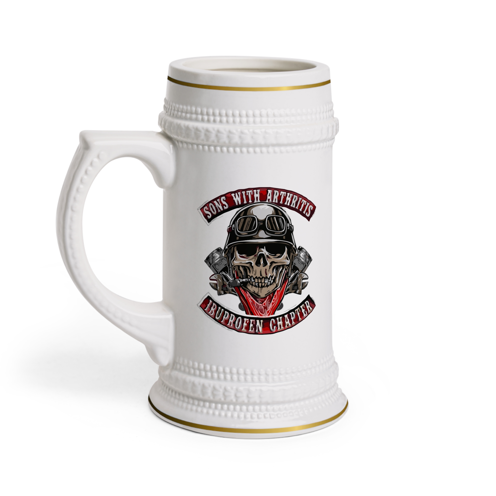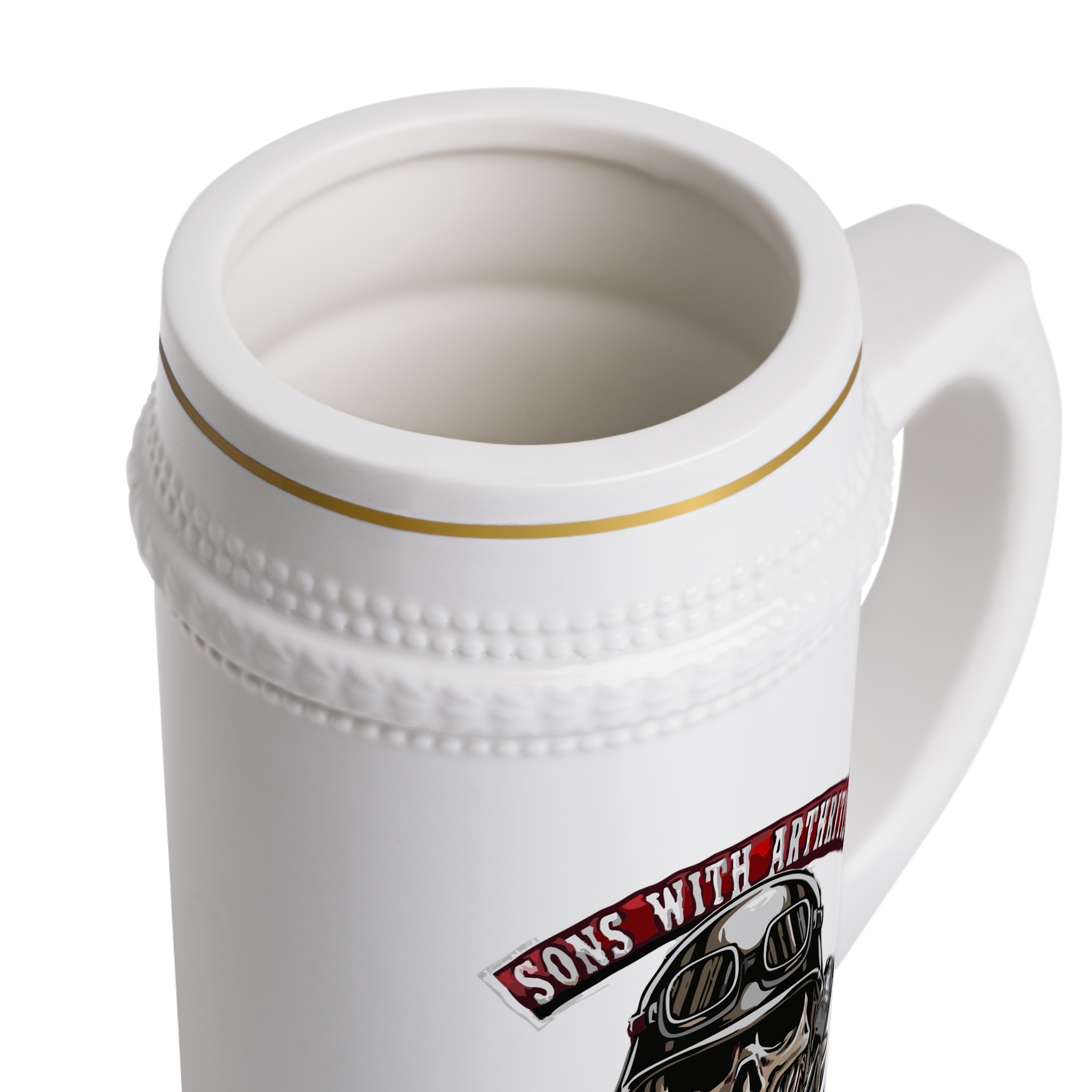 This ceramic stein mug brings bold attitude to your beverage ritual. Its tall, sculpted form and ribbed detailing feel solid and deliberate in hand, while a glossy white surface lets the artwork pop in vivid, scratch-resistant color. The skull-and-goggles motif and crossed wrenches evoke open roads and grease-stained camaraderie, making each sip feel like a moment at the garage or a roadside stop. Built for everyday use, it stands up to the microwave and dishwasher so the look stays sharp through regular wear. Keep it on the counter for morning coffee, beside the workbench, or on the shelf as part of a rugged display.