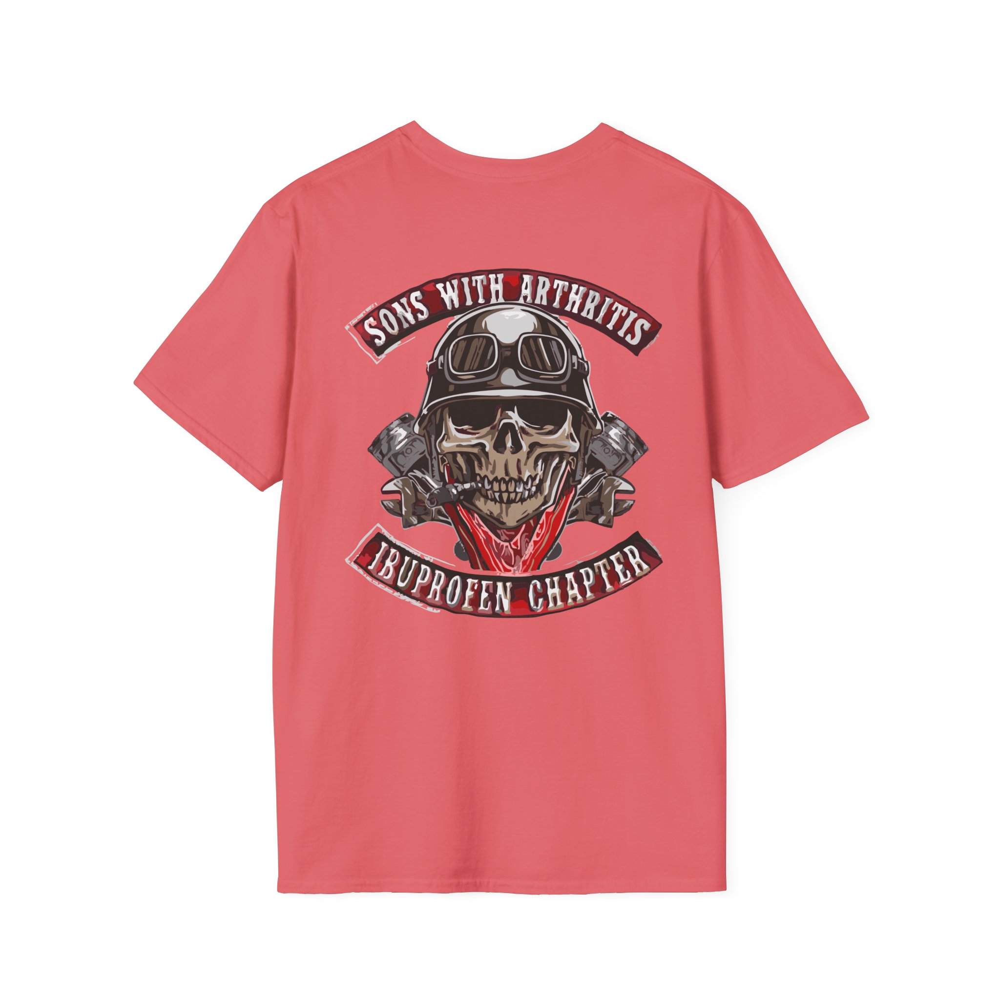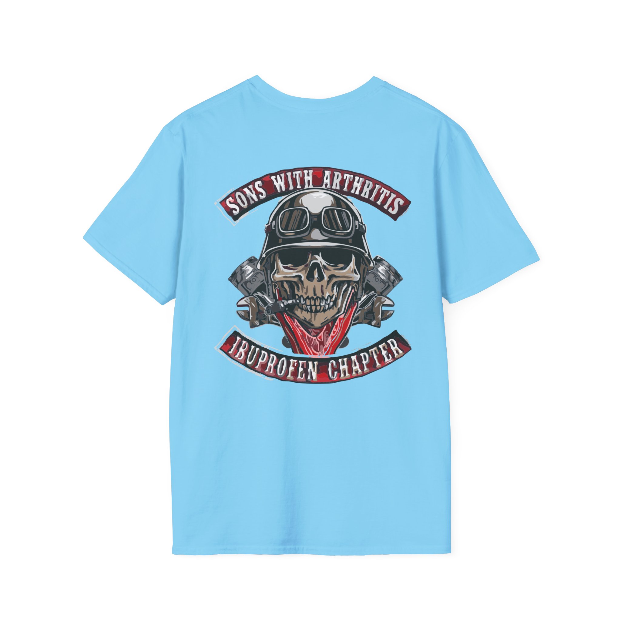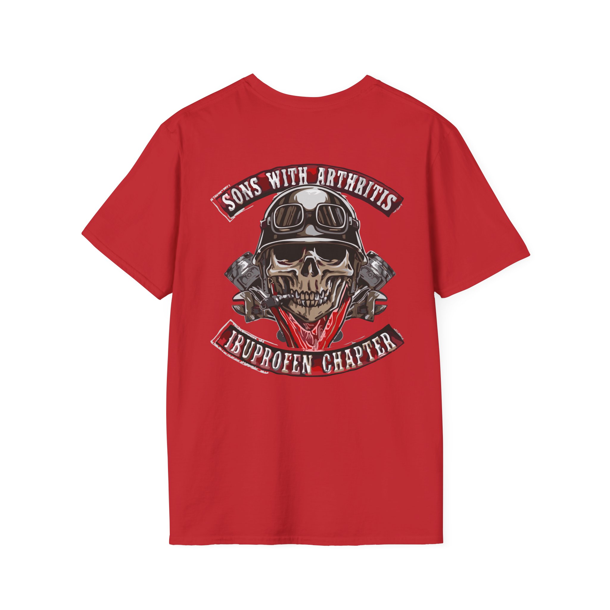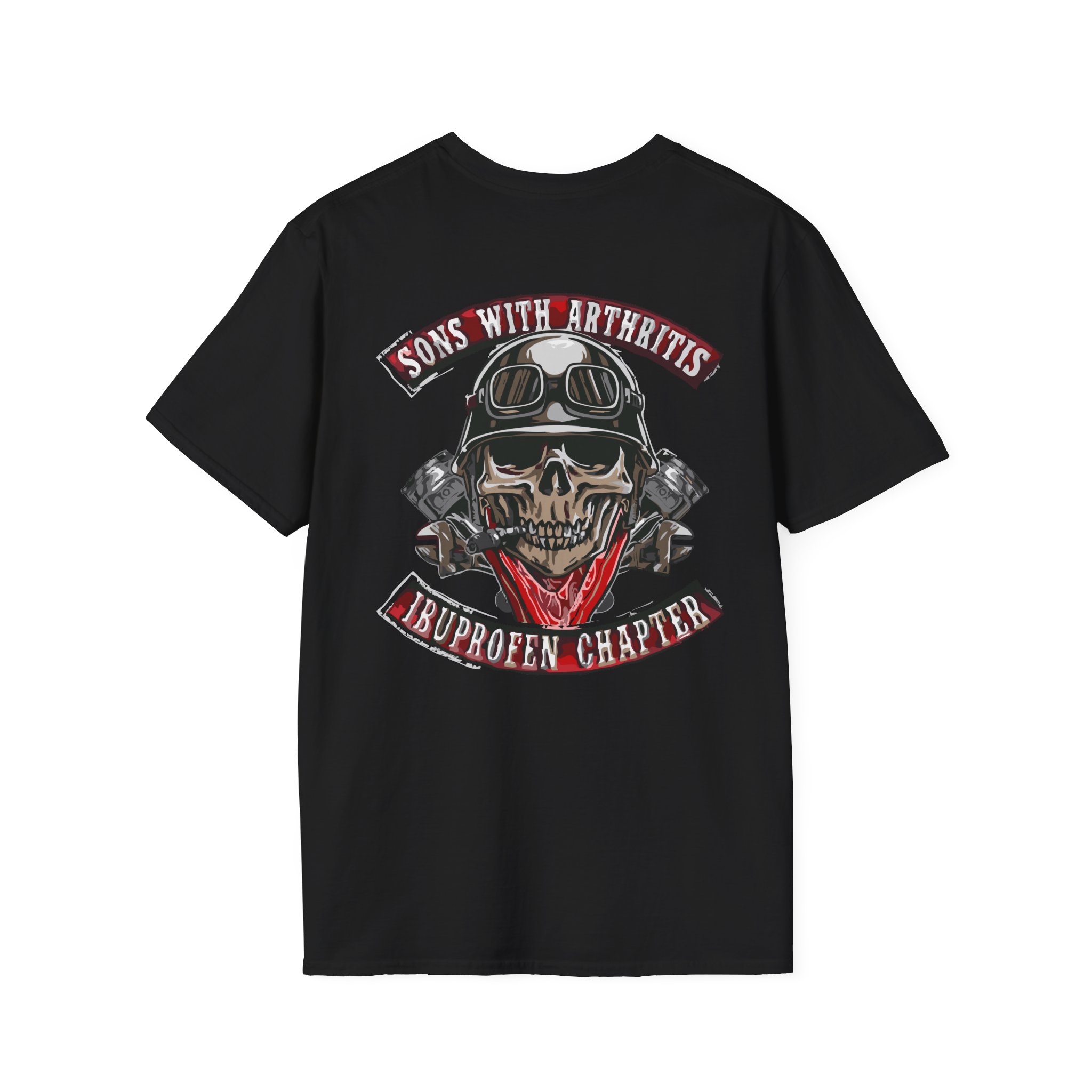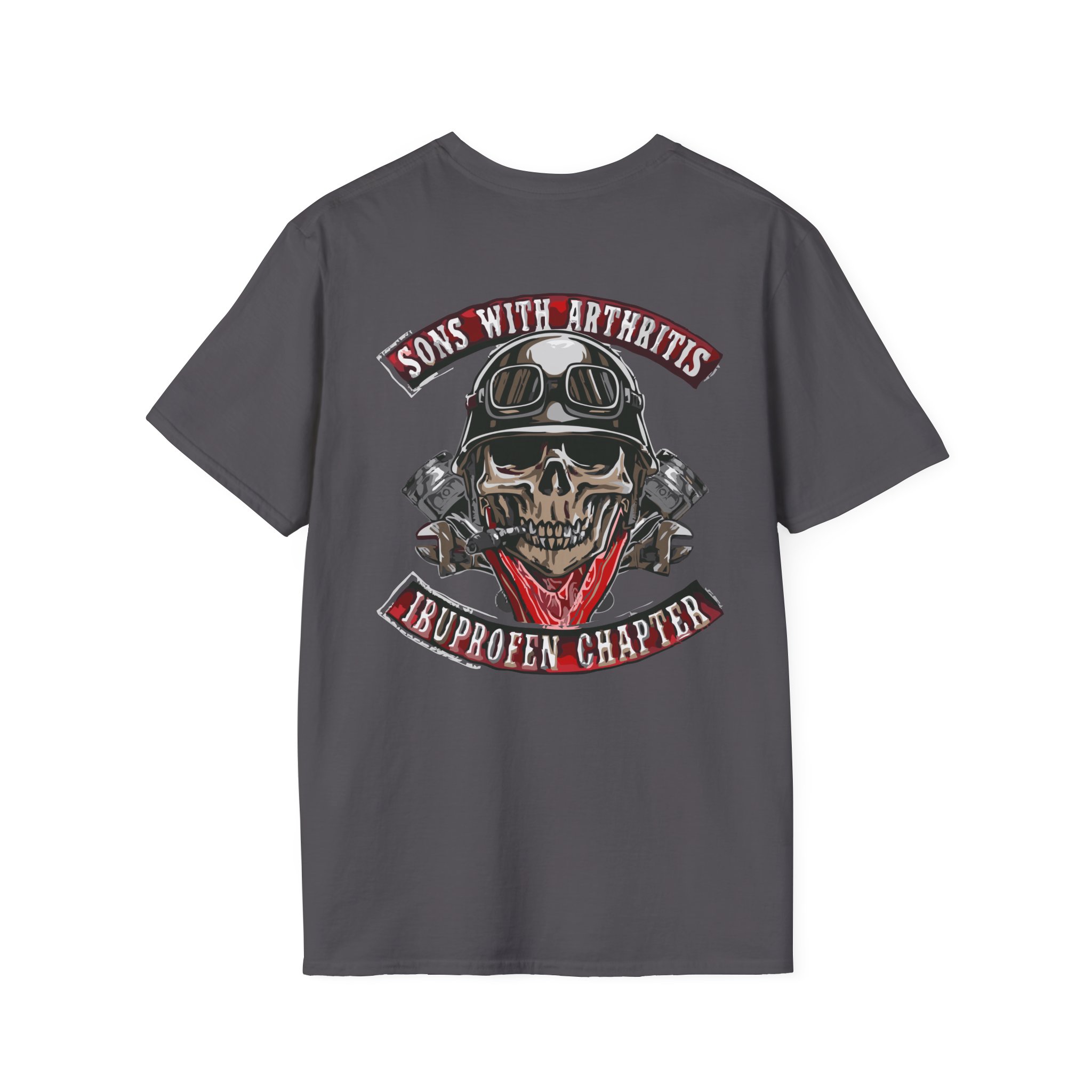 A soft, lived-in tee that carries attitude and comfort in equal measure. The lightweight ring-spun cotton drapes cleanly while the roomy crew cut keeps movement easy — great for weekend rides, garage hangs, or low-key meetups. The bold back graphic — a helmeted skull framed by crossed pistons and a cheeky banner — reads like a patch from a road club with a sense of humor. Wear it beneath a leather jacket or on its own; it settles into the rhythm of the wearer and tells a story without shouting. Built to last through washes and miles, this shirt feels familiar right away and only gets better with time.