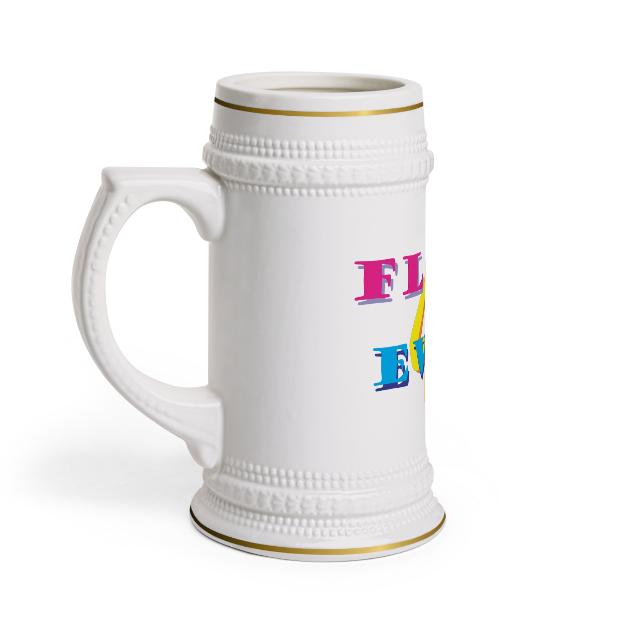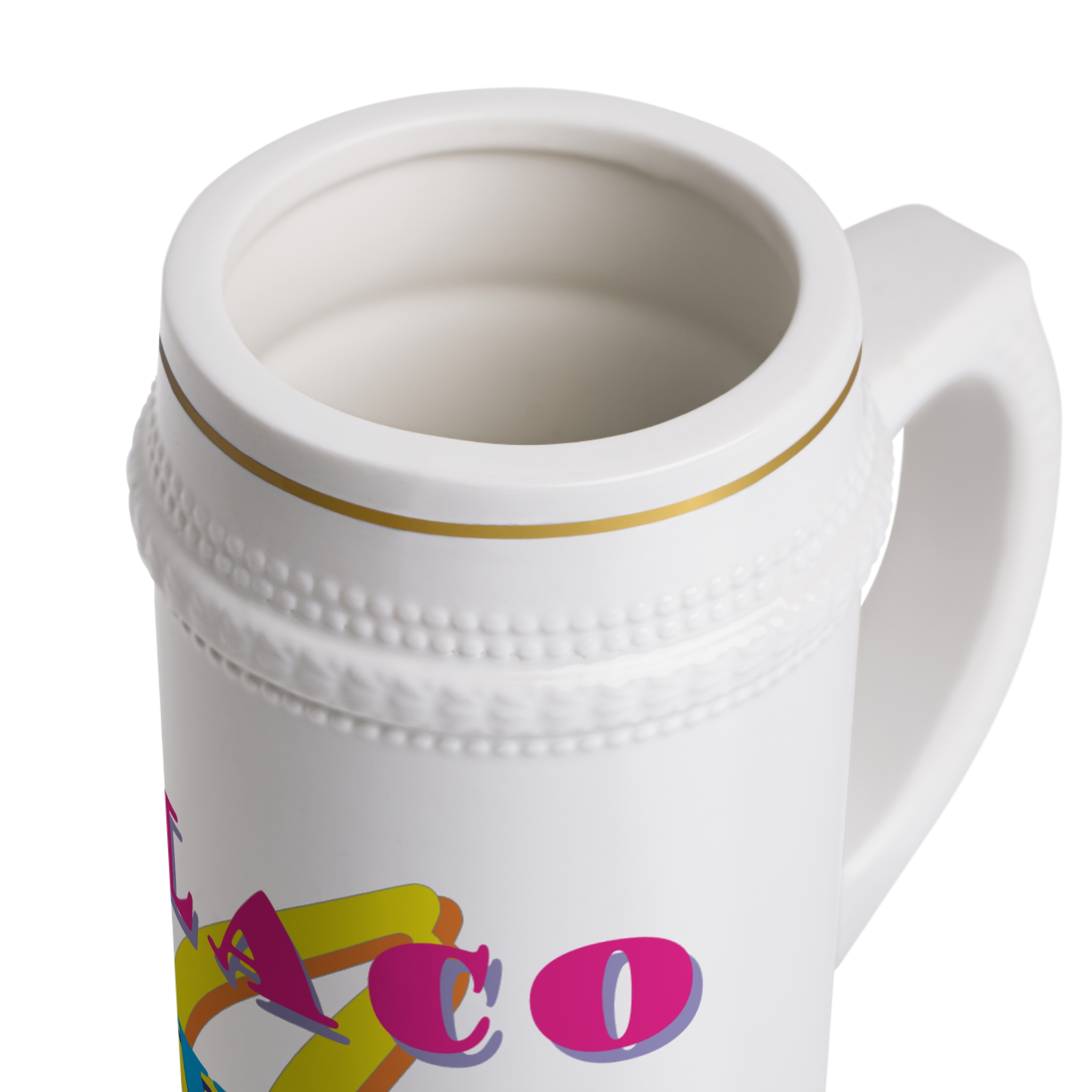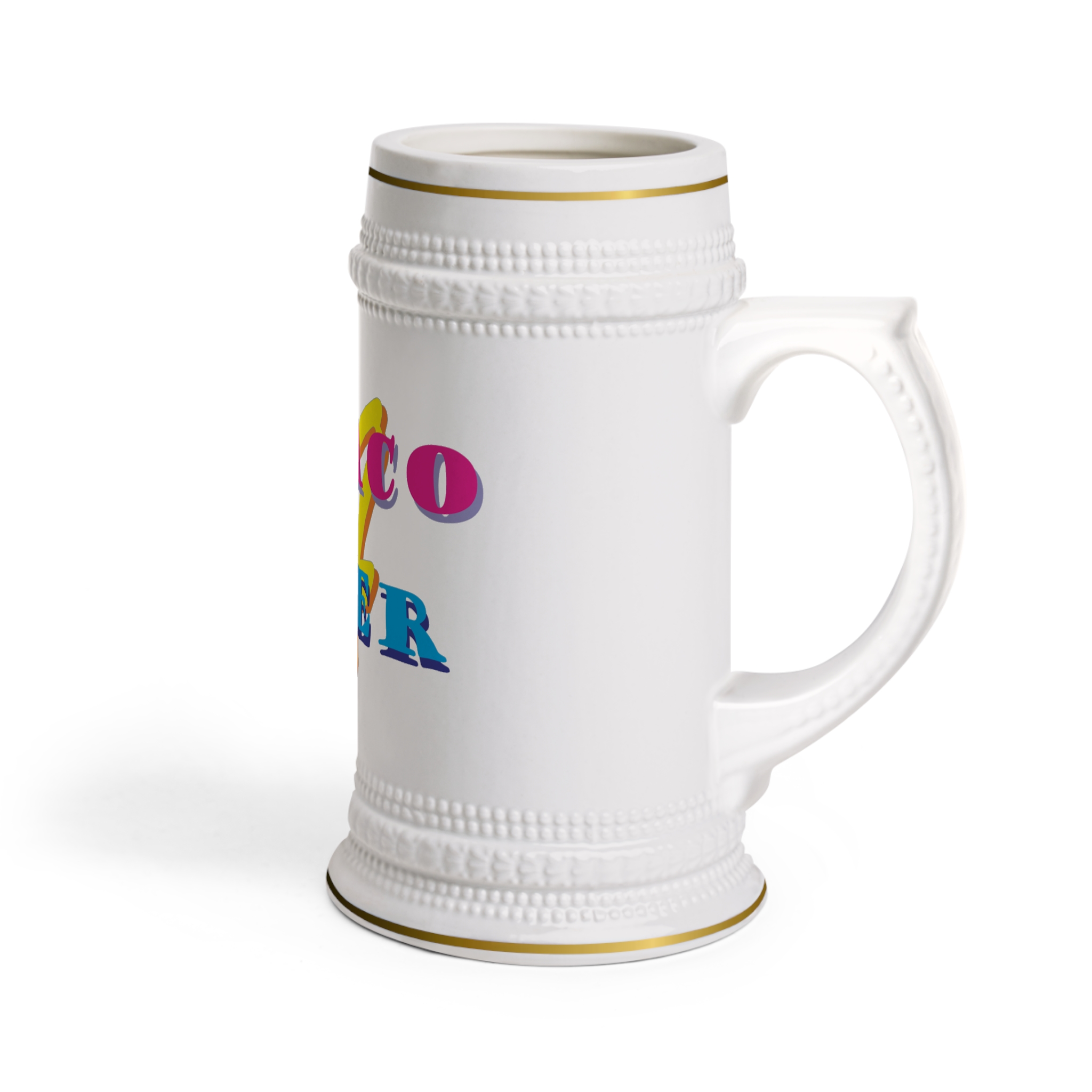 Tall ceramic stein with a cheerful, retro pop-art design that brings bright color and playful energy to morning coffee or evening beer. The ribbed silhouette and gold-trim accents give it an heirloom feel while the glossy white surface keeps the artwork vivid. Holds a generous pour and stands out on a crowded shelf—use it to celebrate casual get-togethers, lazy weekends, or to add a bit of personality to your tabletop. Dishwasher- and microwave-safe, it’s built for everyday use without losing its shine.